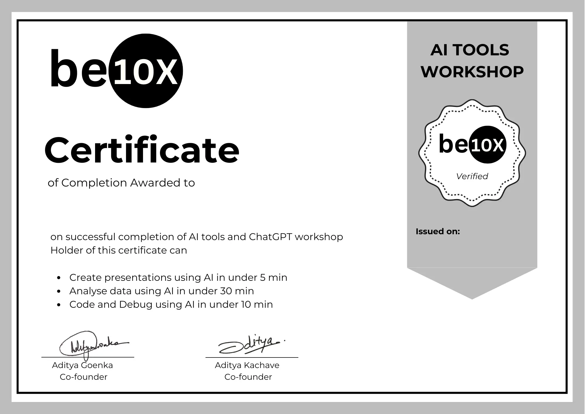 Absolutely. You will be certified by Be10X Cofounders – Aditya Goenka and Aditya Kachave who have jointly built multiple 8 figure companies with the help of AI tools.